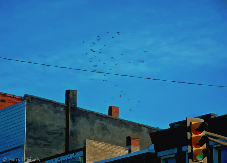Love this composition. Hopperesque! The traffic light, the birds, electrical wire, colors, textures, geometrics – you got it all.